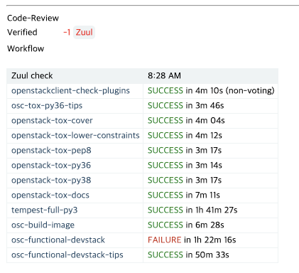 osc-functional-devstack을 클릭하면, 왜 실패했는지 확인할 수 있는 페이지로 이동 됩니다.