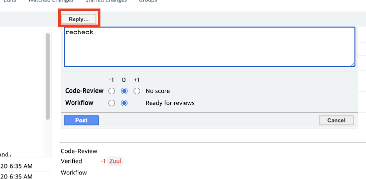 gerrit 사이트로 가서 recheck 라고 댓글을 남기면 다시 zuul이 동작하게 됩니다.