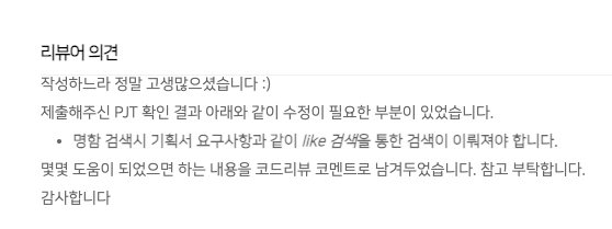 그 외에 컨벤션, 예외처리, 메소드 단위분리, 네이밍은 통과를 주셨습니다.