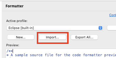 Preferences -> JAVA -> Code Style -> Formatter 로 이동해줍니다. 저는 기본적으로 설정이 Eclipse로 활성화 되어 있습니다.
