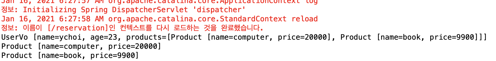 println으로 UserVo객체와 ProductVo객체를 살펴보면 jackson에 의해 객체로 맵핑되어 있는 것을 볼 수 있습니다.