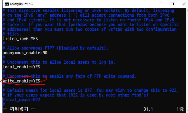 #으로 주석 처리가 되어 있는데 #을 지우고 쓰기 허용을 해준 뒤 저장을 해줍니다.