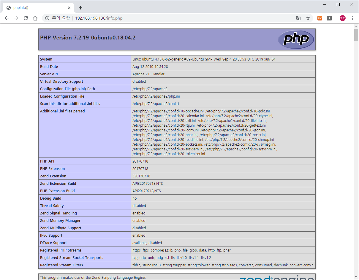 우분투 서버 아이피로 접속하면 php가 정상적으로 실행되는 것을 볼 수 있습니다.