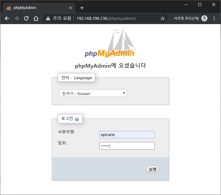 이제 유저 아이디와 패스워드를 입력을 하면 phpmyadmin페이지에 접속할 수 있습니다.