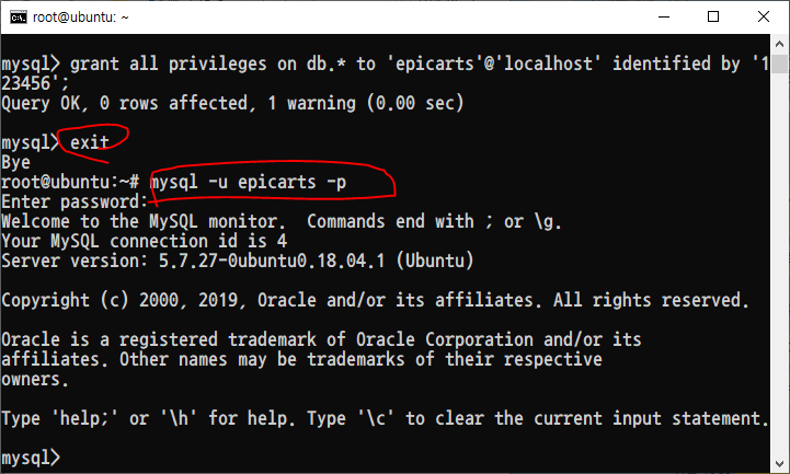mysql -u epicarts -p