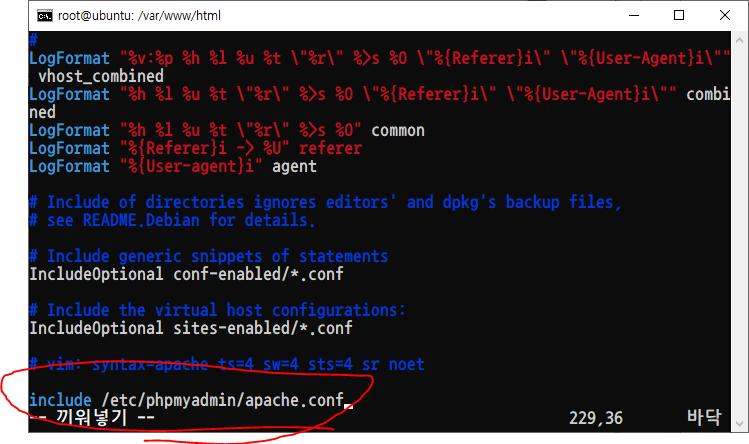 맨 밑에 include /etc/phpmyadmin/apache.conf를 추가시켜 줍니다.