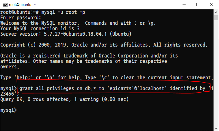 grant all privileges on db.* to 'epicarts'@'localhost' identified by '123456';