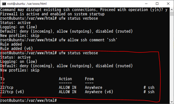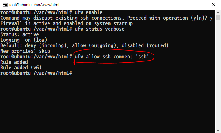 이제 방화벽이 활성화되었으므로 기존에 사용하던 SSH 접속이 불가능할 것입니다.