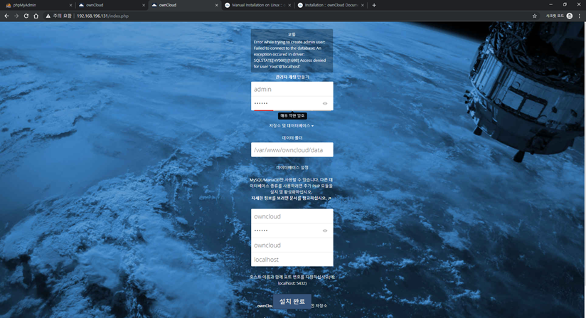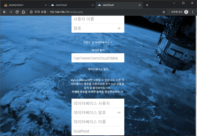이처럼 내 아이피로 접속하면 owncloud 페이지가 보입니다.