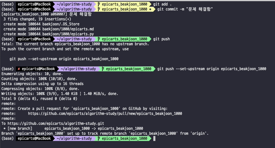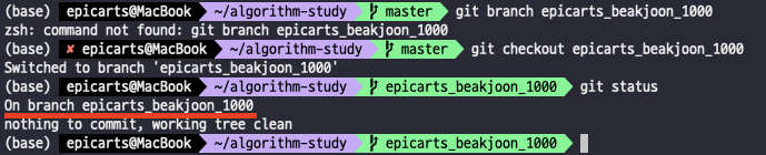epicarts_beakjoon_1000이라는 이름의 브런치가 만든 후에 checkout 옵션을 사용하여 브런치를 변경하였습니다.