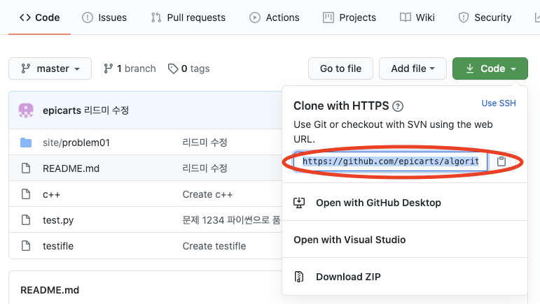 먼저, https://github.com/epicarts/algorithm-study에 접속을 해줍니다.