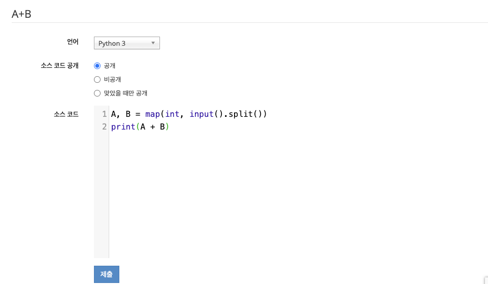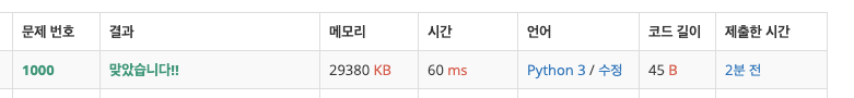 문제 두 정수 A와 B를 입력받은 다음, A+B를 출력하는 프로그램을 작성하시오. 입력 첫째 줄에 A와 B가 주어진다. (0 < A, B < 10) 출력 첫째 줄에 A+B를 출력한다. 예제 입력 1 복사 1 2 예제 출력 1 복사