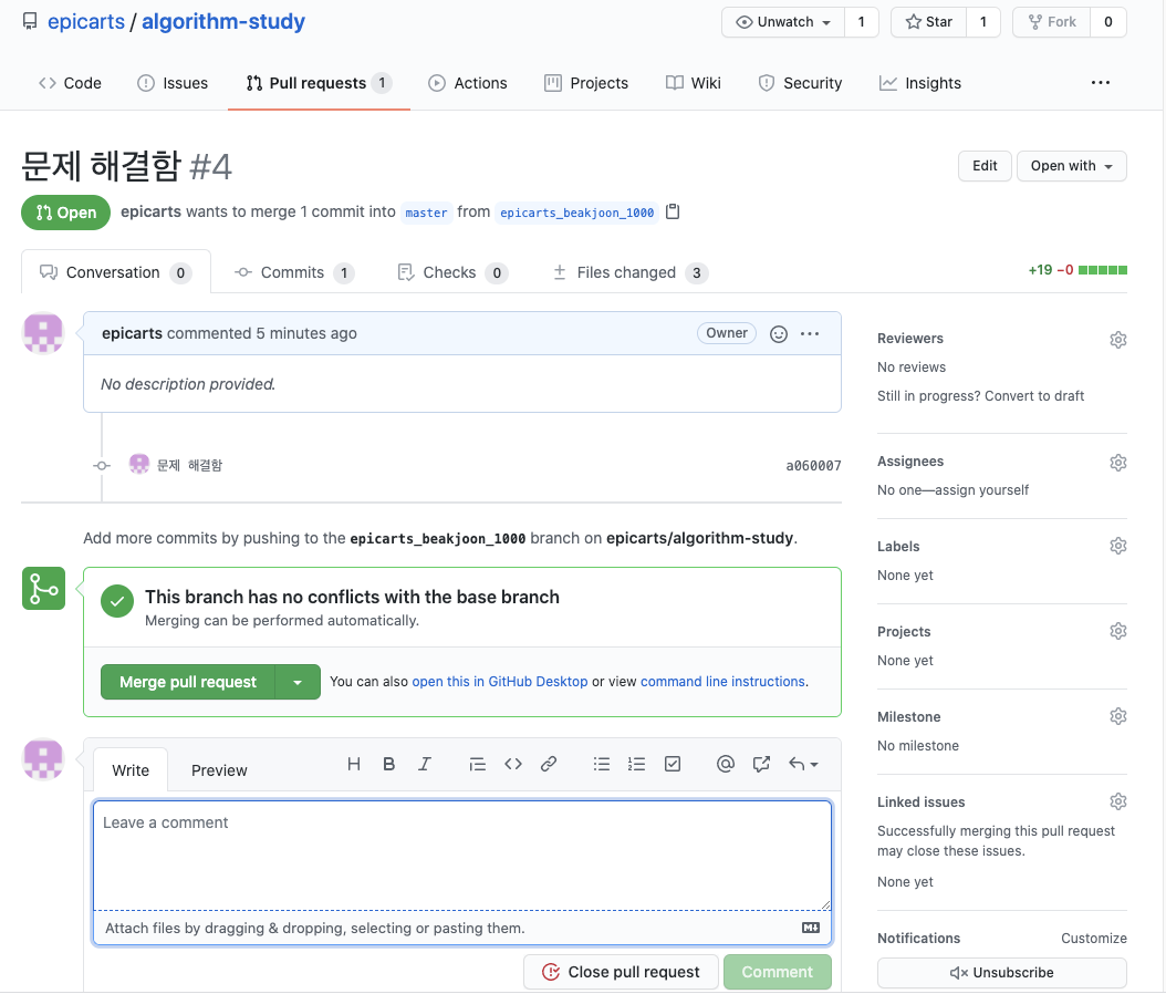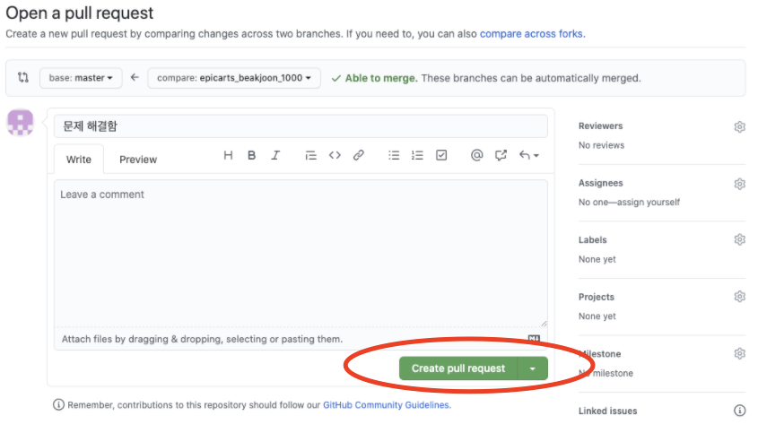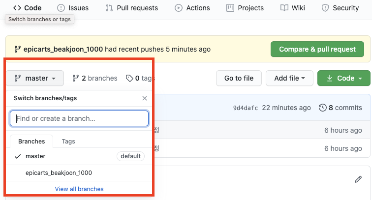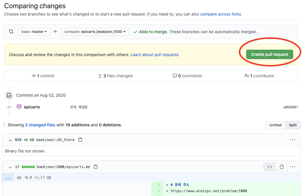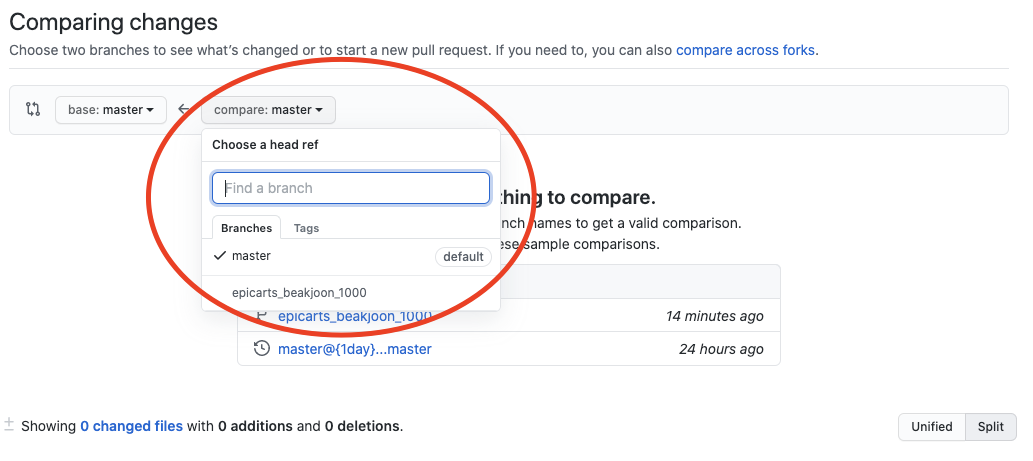 compare 부분의 브런치를 master => epicarts_beakjoon_1000(브런치명)으로 바꿔주시면 됩니다.