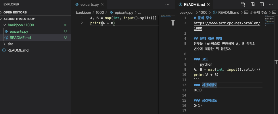 1000번 문제를 풀었으므로, 1000이라는 폴더에 들어가 줍니다.(없으면 새로 생성)
