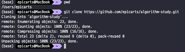 그리고 다운로드하길 원하는 폴더로 이동하여 터미널 창에 "git clone 복사한 URL"을 입력하면 폴더가 다운로드됩니다.