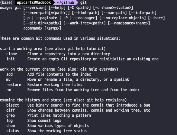 윈도는 CMD, 맥은 터미널 창에서 git을 입력했을 때, 설치가 제대로 되었다면 위와 같은 화면이 뜨게 됩니다.