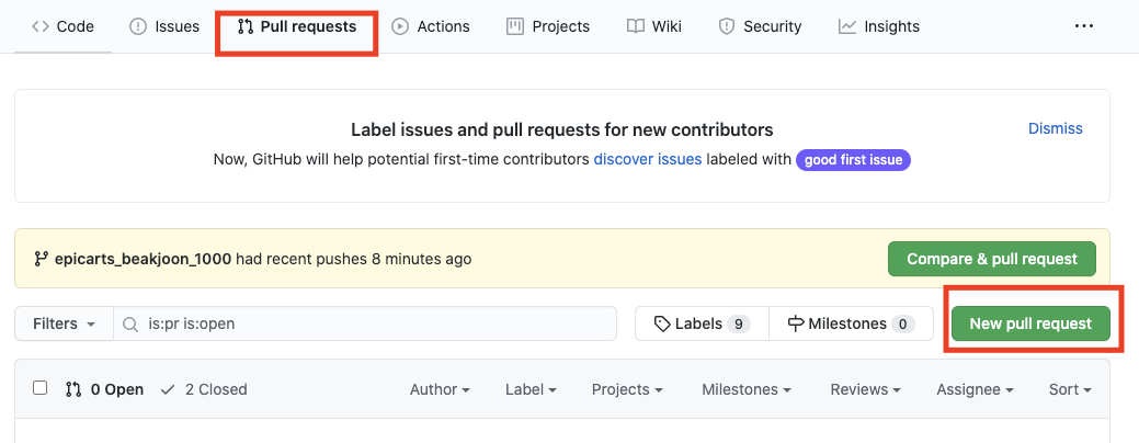 Pull requests를 보면 방금 만든 풀 리퀘스트(pull requests)가 있는 것을 볼 수 있습니다.